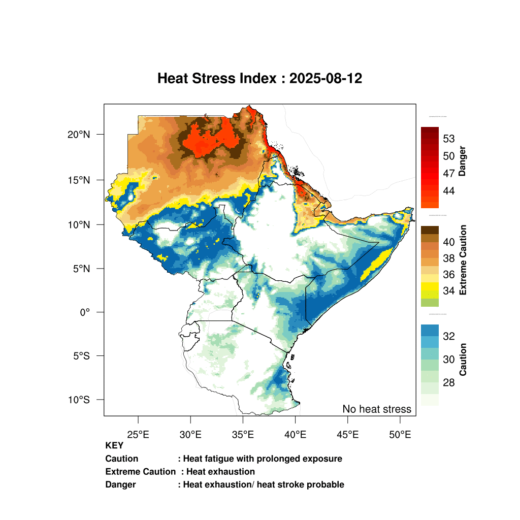 Heat stress risks will be elevated in northern Sudan, the Red Sea coast, Ethiopia’s Afar region, and coastal Somalia.