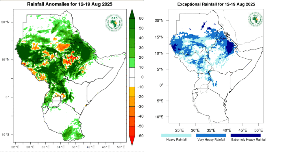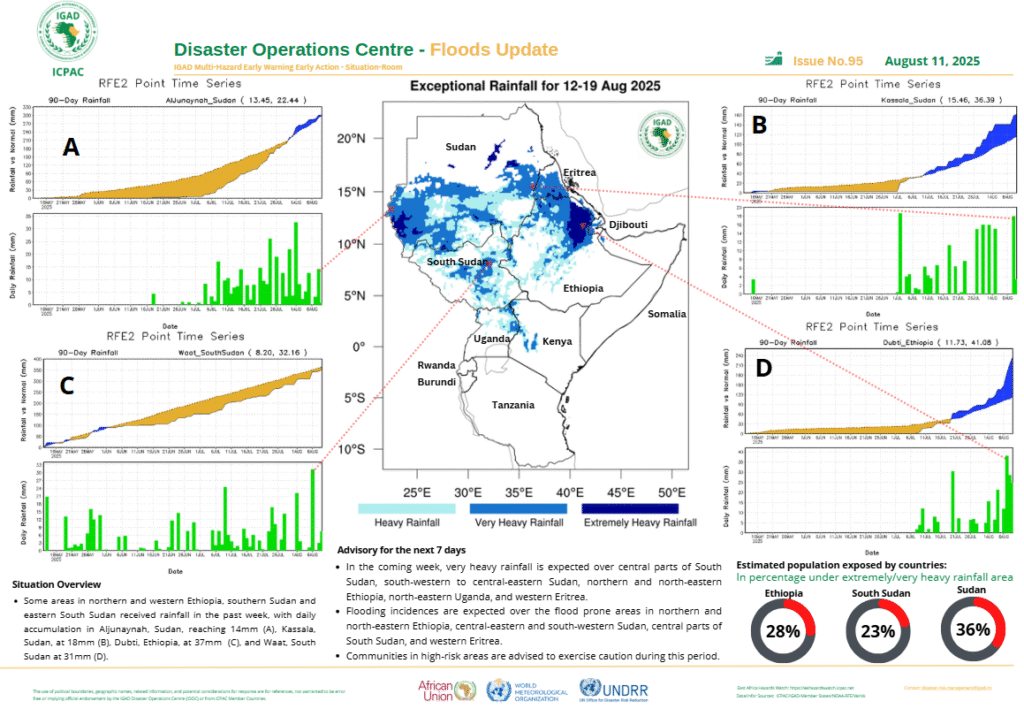Between August 12 and 19, 2025, much of northern East Africa is expected to experience exceptional rainfall, particularly across Sudan, Ethiopia, Eritrea, Djibouti, and South Sudan.
