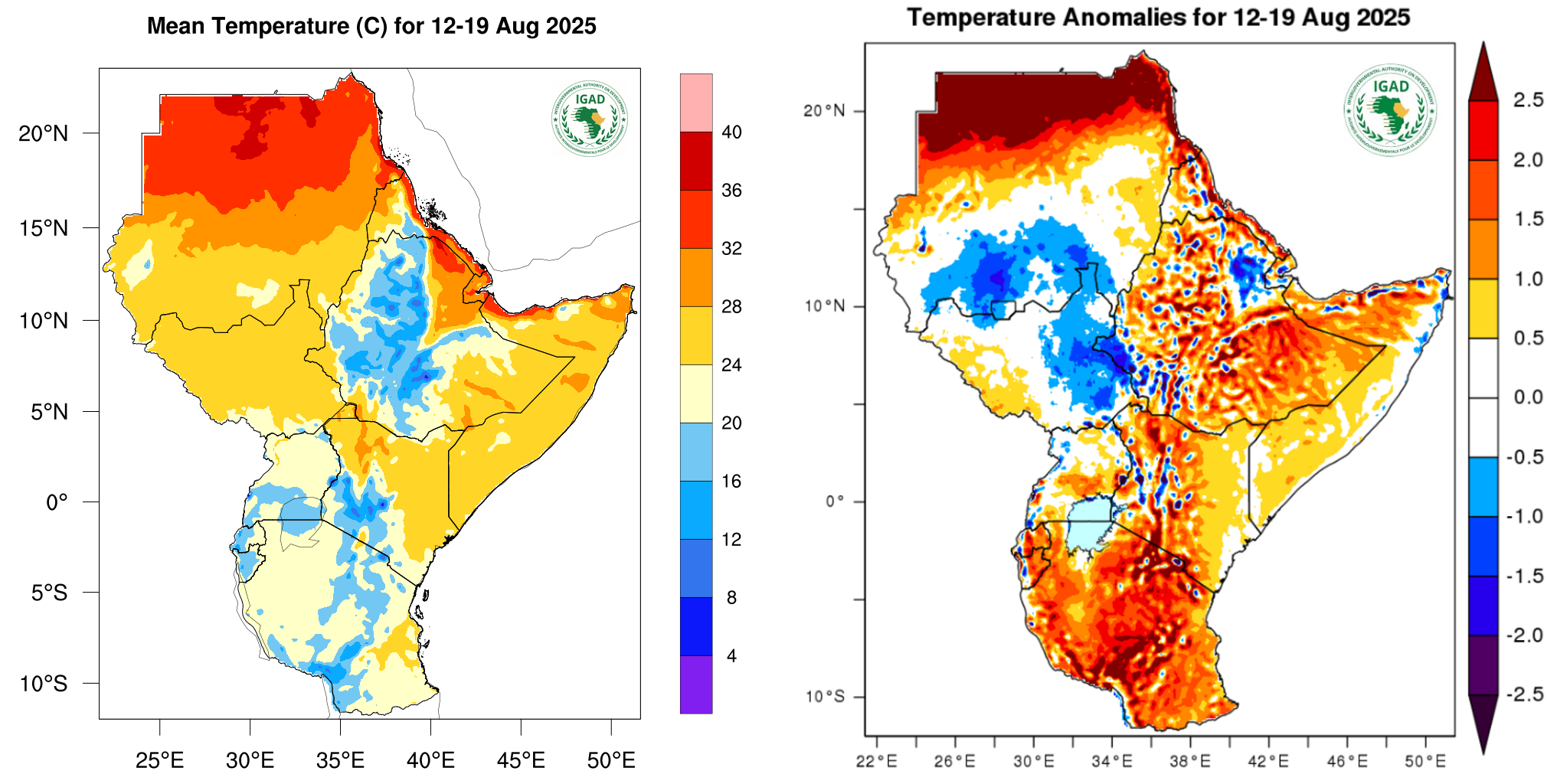 Moderate to high temperatures, between 20°C and 32°C, will dominate Somalia, eastern and southeastern Ethiopia, Eritrea, southern Sudan, South Sudan, central to northern Uganda, eastern and northern Kenya, and most of Tanzania.